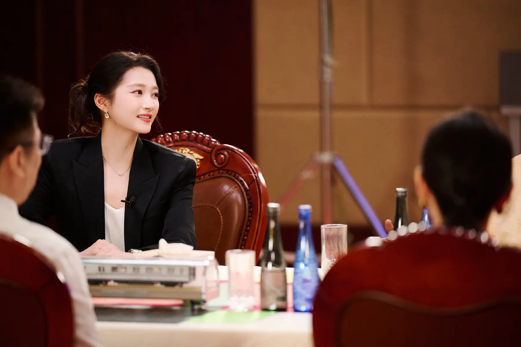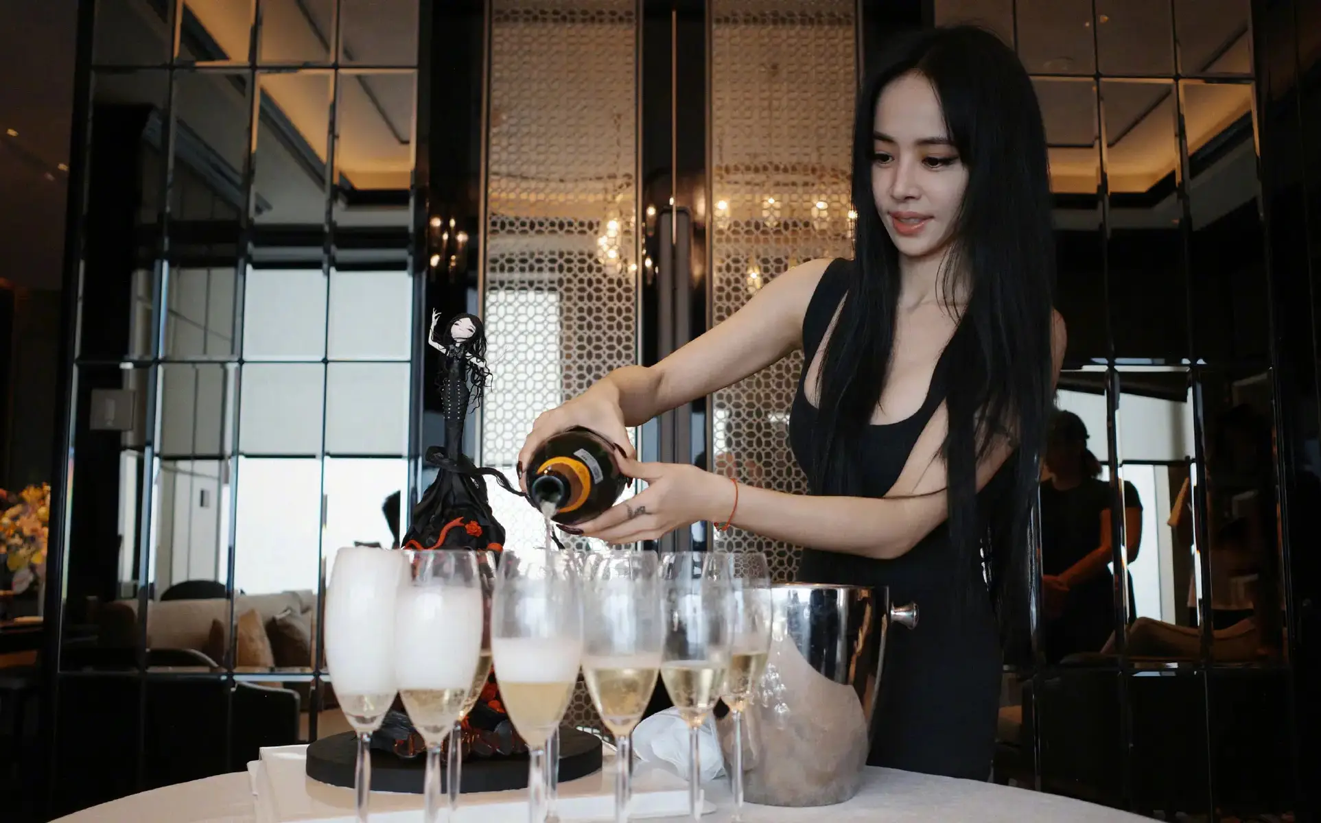 鐘楚曦出席武漢SKP一周年慶典活動 黑色深V長裙時尚大氣