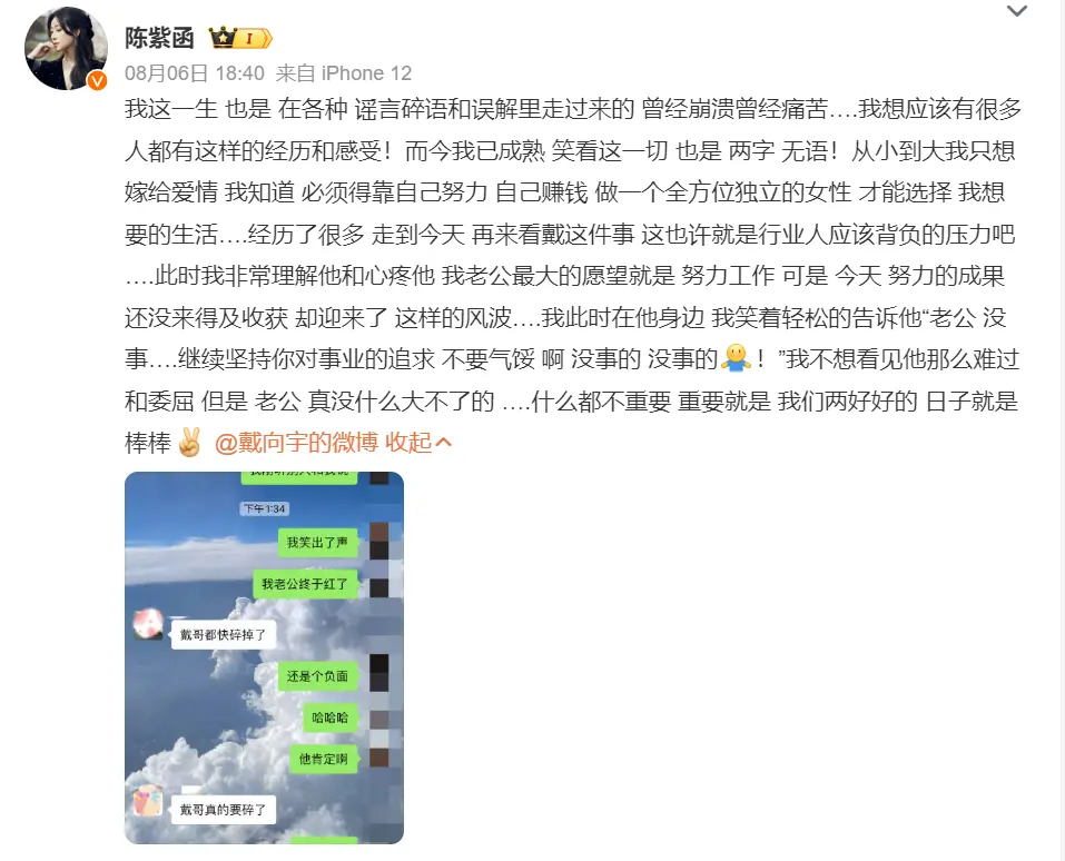 8月6日,陳紫函(明星經(jīng)紀(jì)公司)發(fā)文力挺老公戴向宇,稱自己對曝戴向宇嫖娼事件,只有兩個字無語,她表示“這也許就是行業(yè)人應(yīng)該背負(fù)的壓力吧”,同時(shí)表達(dá)了對老公的理解和心疼,并告訴他沒事:“老公沒事繼續(xù)堅(jiān)持你對事業(yè)的追求,不要?dú)怵H,啊,沒事的,沒事的!”她還在和朋友的聊天記錄中透露自己心態(tài)對這件事的心態(tài)很好,并稱自己的老公終于紅了。