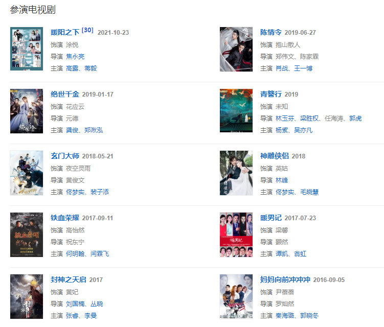 代表作品:后宮、女?huà)z傳說(shuō)之靈珠、單親媽媽、天天有喜2、陳情令、深宮諜影、唐宮燕