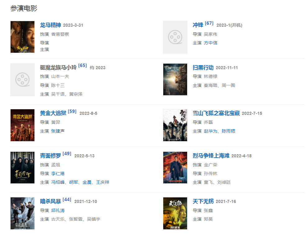 2023年1月11日,參演的電影《天龍八部之喬峰傳》發(fā)布“快意恩仇”版預告,定檔大年三十(1月21日)上線。